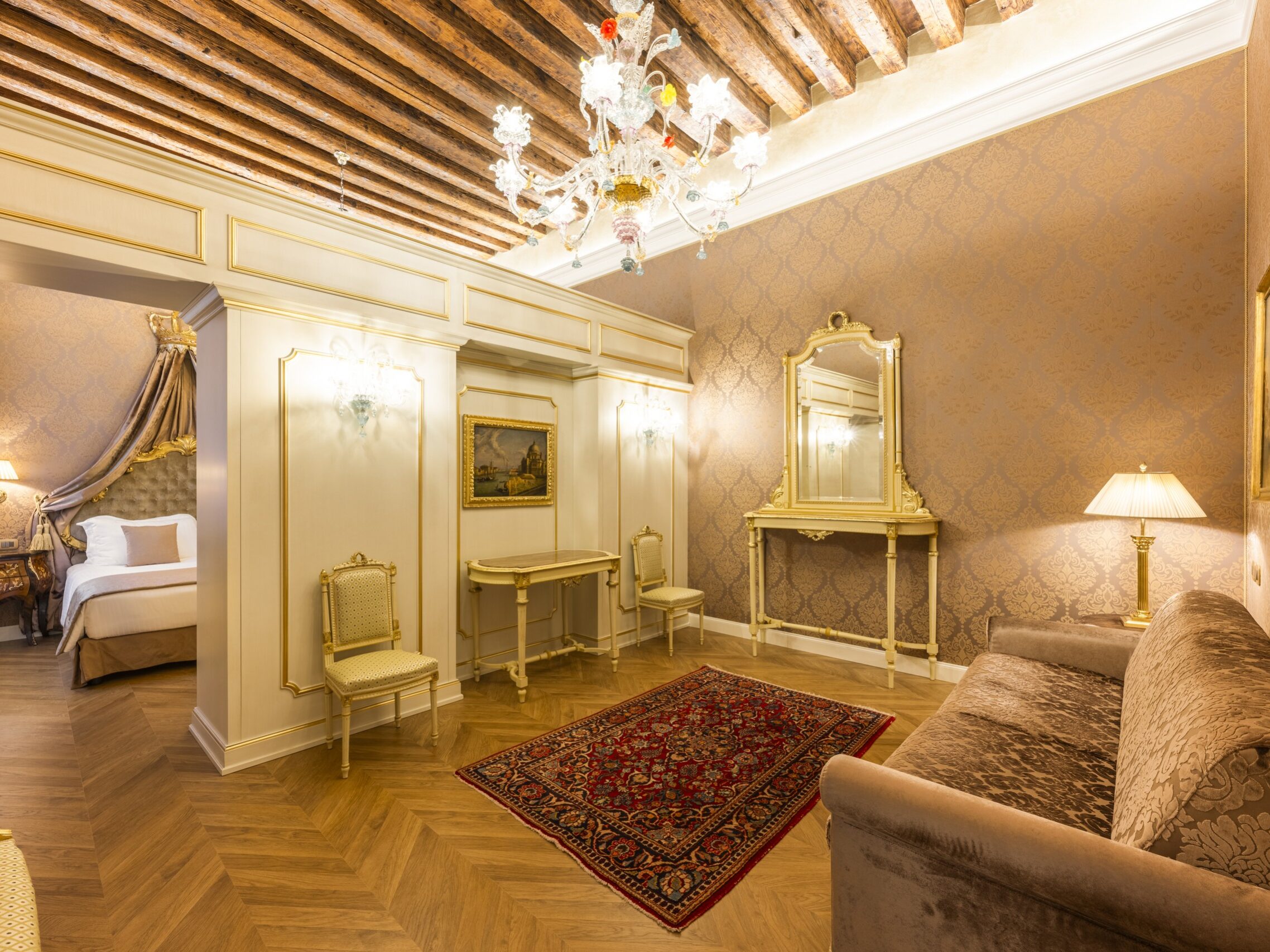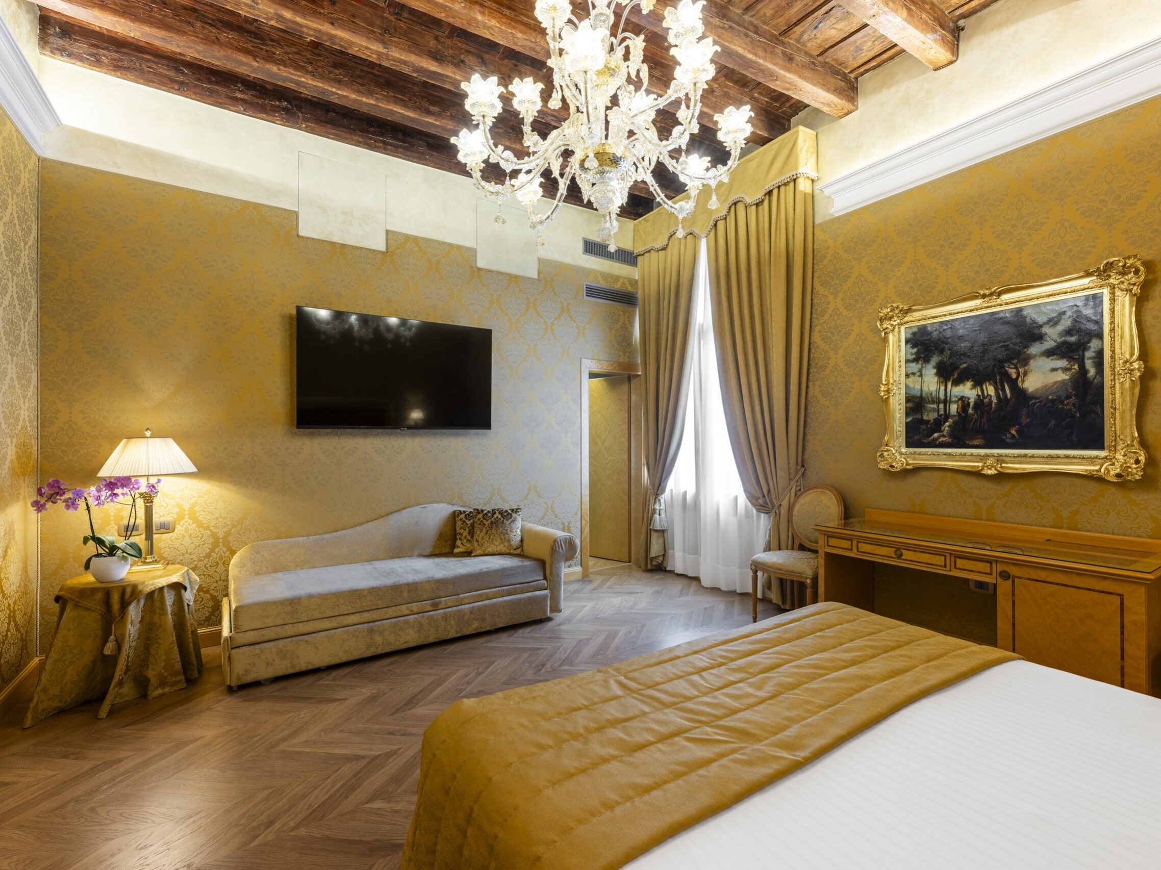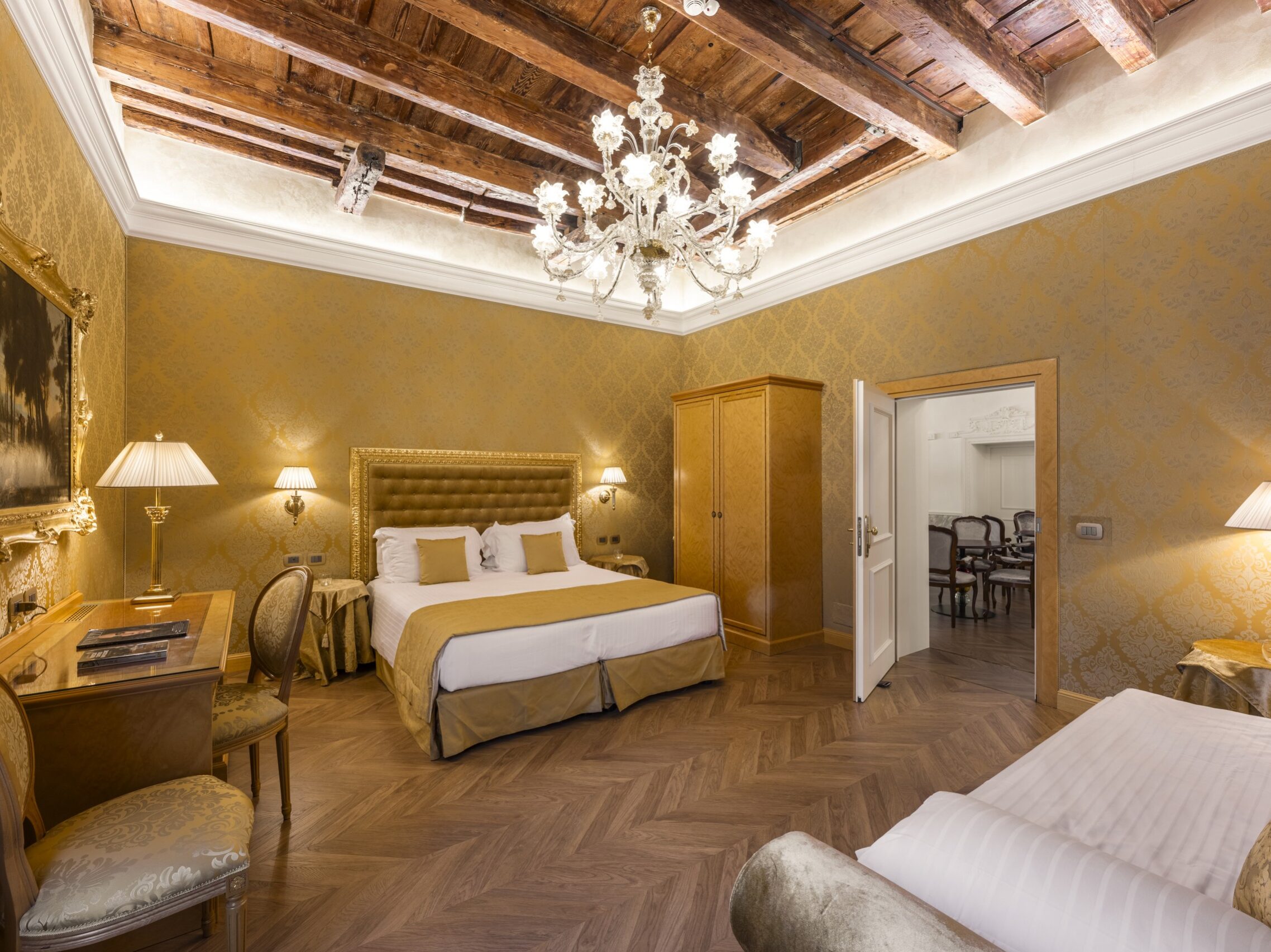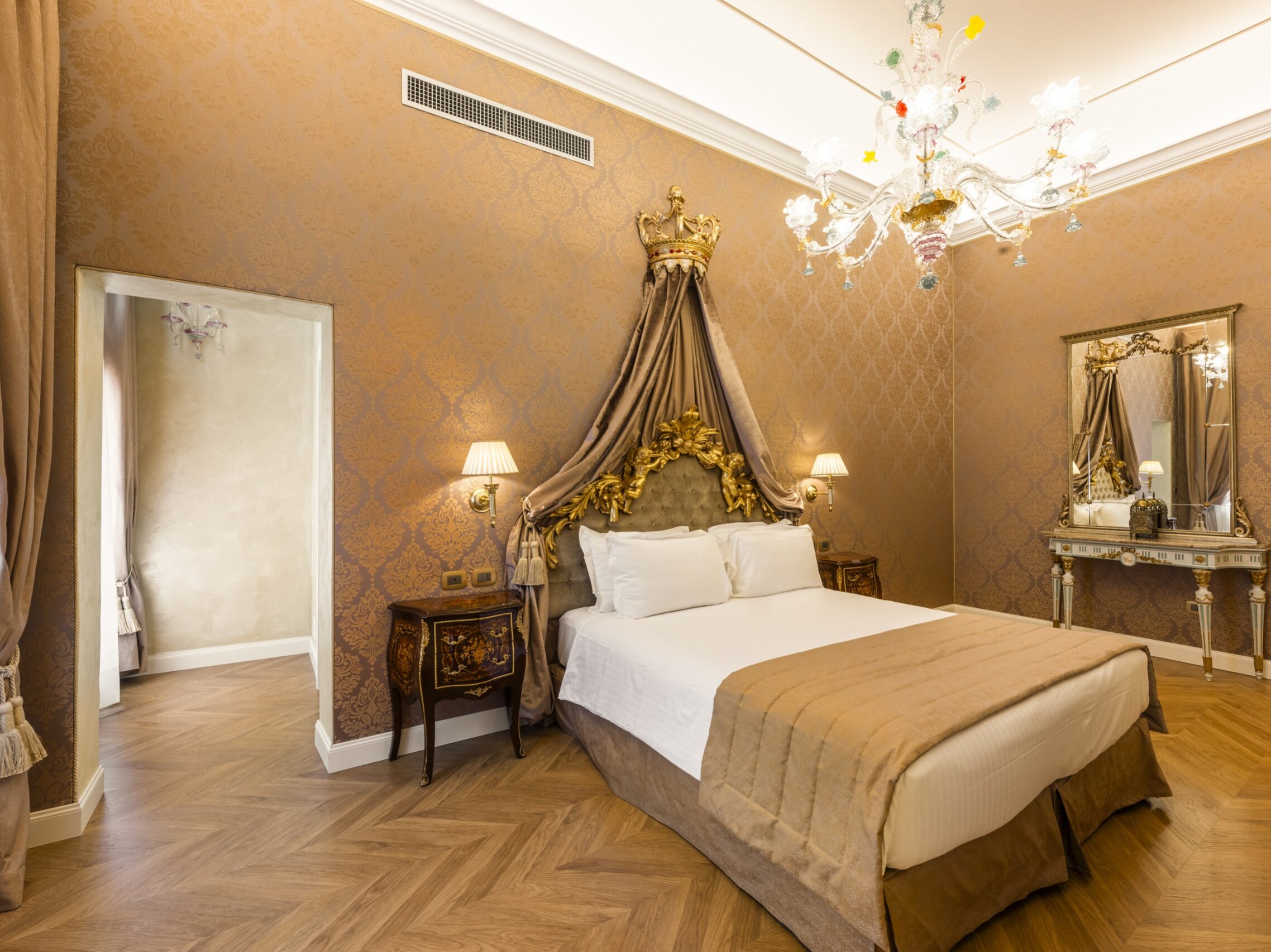 Arredata con stoffe alle pareti, parquet posato a spina di pesce e soffitto con travatura a vista, la camera dispone di salottino alla francese ed è impreziosita da letto con corona a baldacchino di fattura toscana del 1700, 2 lampadari in stile “Rezzonico” ad 8 luci e applique in vetro di Murano, mobili in legno di betulla in stile impero e dipinti ad olio alla parete originale di fine ‘800.