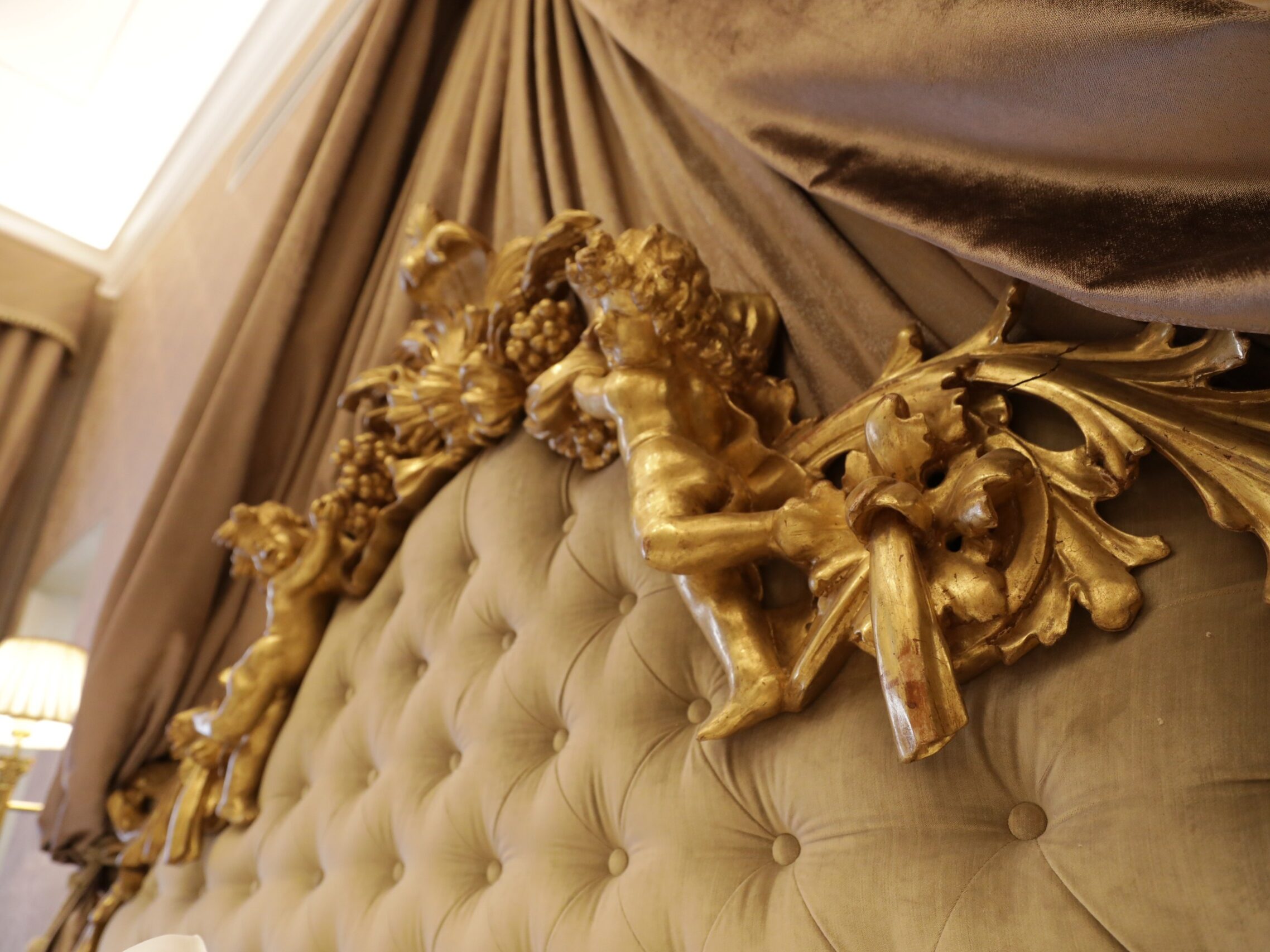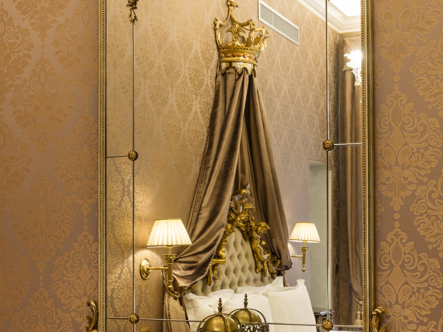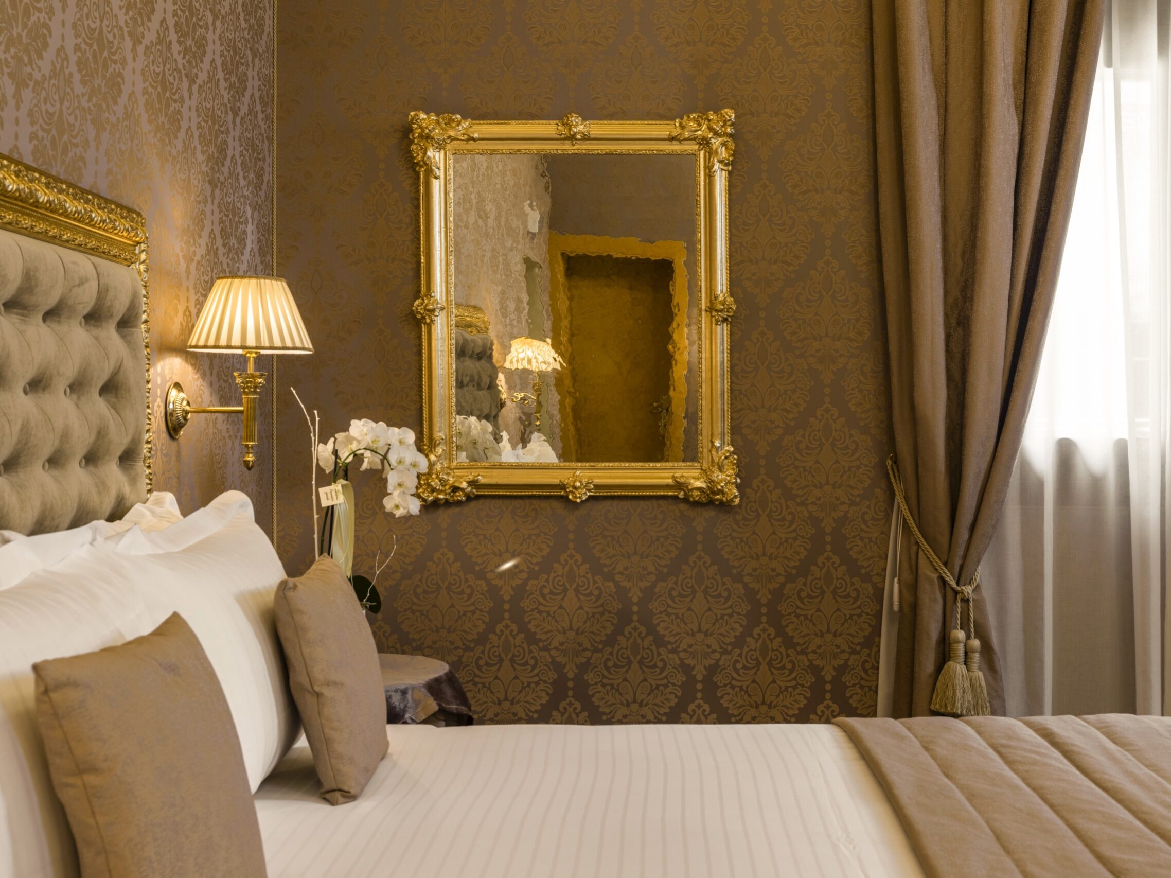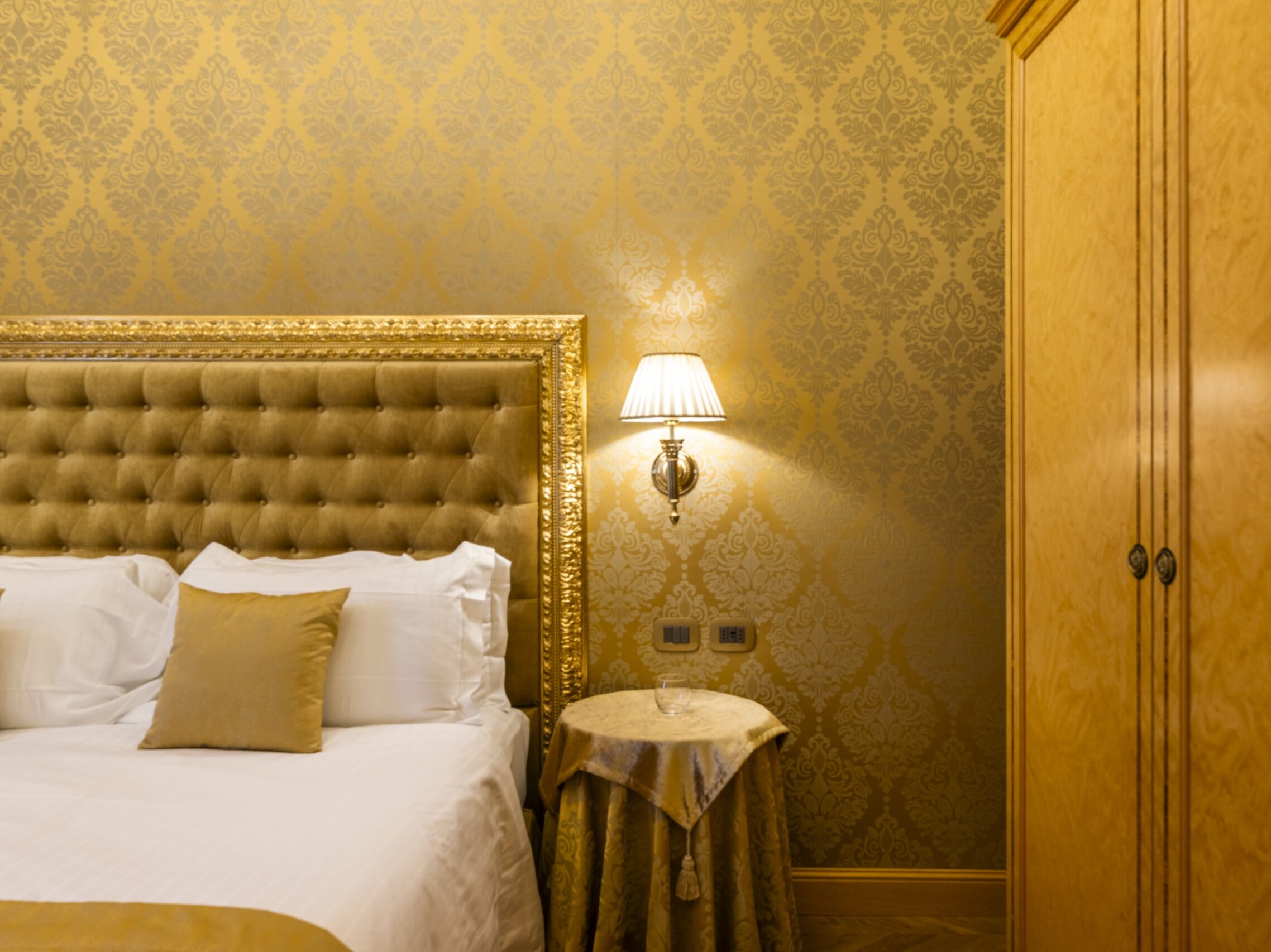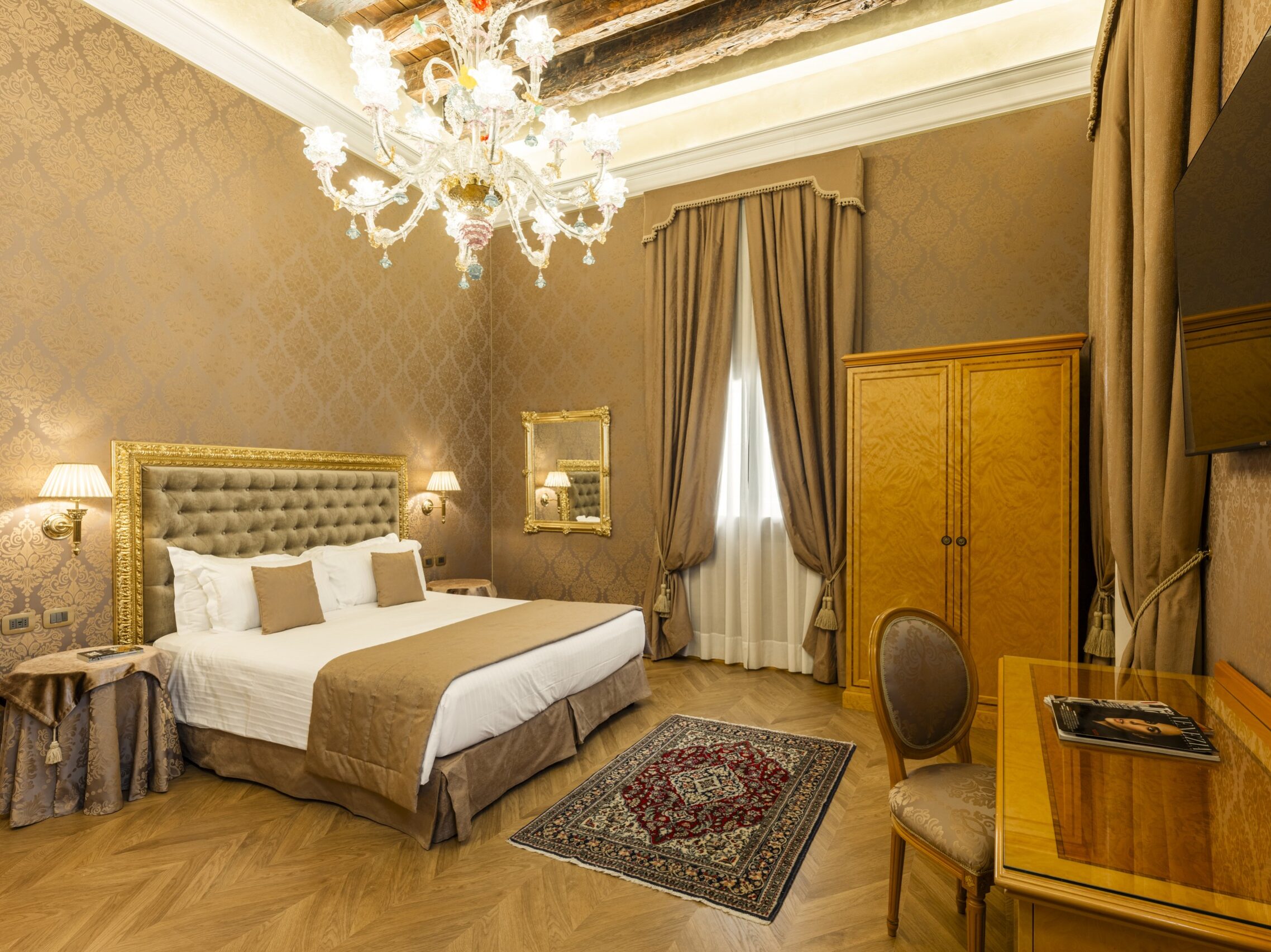 Arredata con stoffe alle pareti, parquet posato a spina di pesce e soffitto con travatura a vista, la camera dispone di salottino alla francese ed è impreziosita da letto con corona a baldacchino di fattura toscana del 1700, 2 lampadari in stile “Rezzonico” ad 8 luci e applique in vetro di Murano, mobili in legno di betulla in stile impero e dipinti ad olio alla parete originale di fine ‘800.