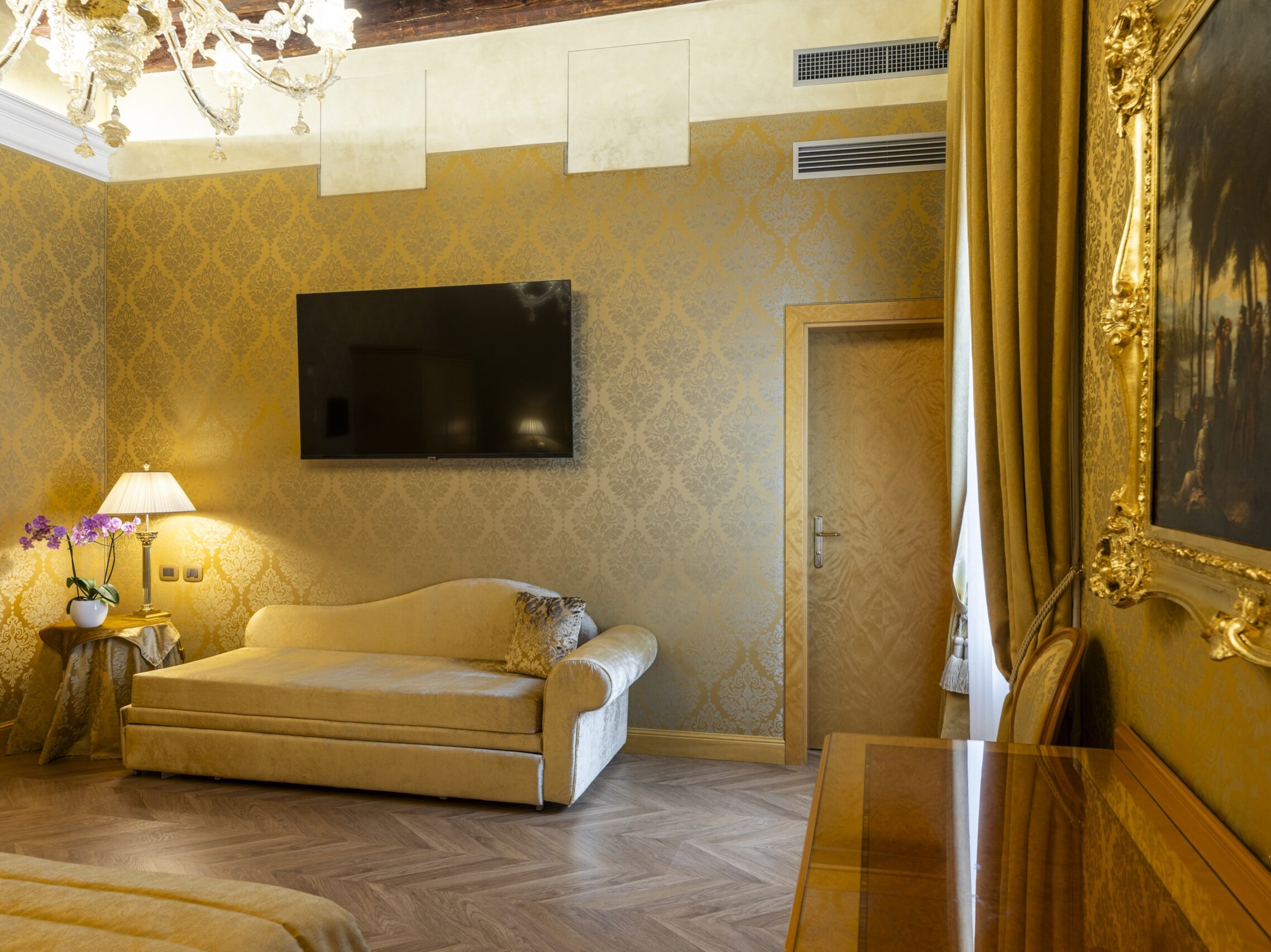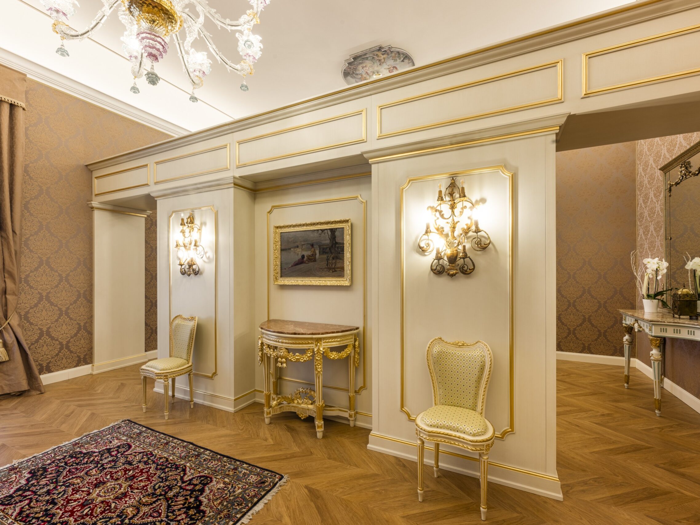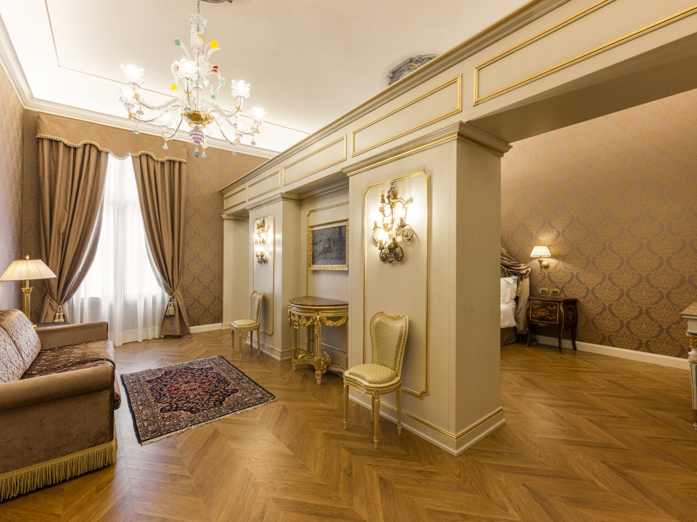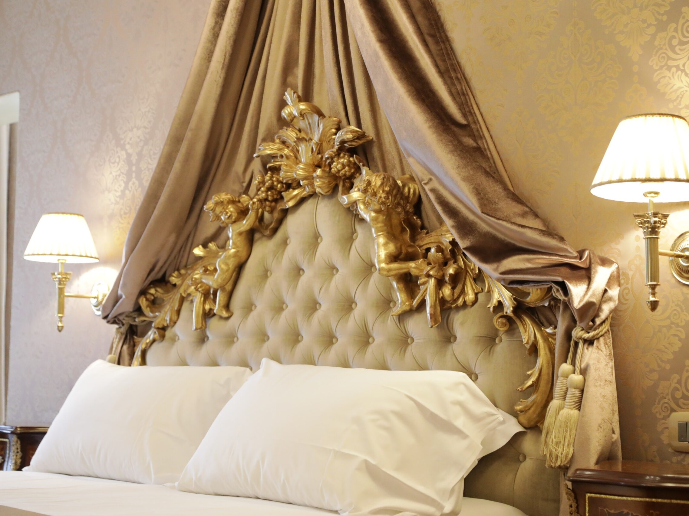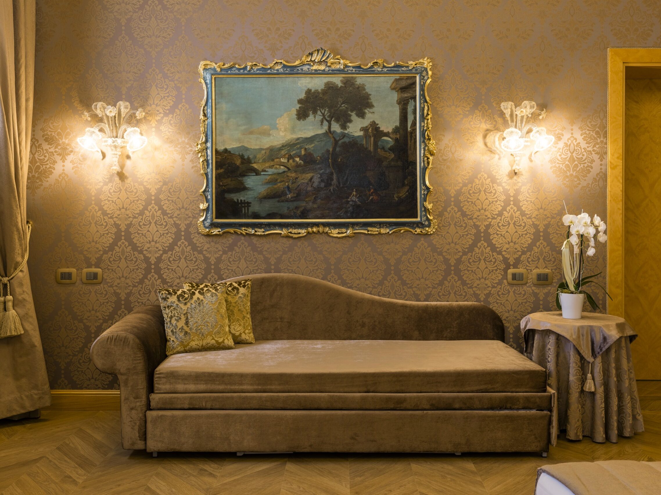 A lato del salone centrale sono ubicate le camere come in uso all’epoca, eleganti ed accoglienti con generosi spazi interni, alti soffitti, pareti e tendaggi impreziositi da pregevoli stucchi sopraporte e stoffe damascate alle pareti, che donano grande eleganza alla struttura. Potrete ammirare sculture antiche di Mori, busti in marmo, quadri d’epoca e lampadari di Murano in stile rezzonico, contorniati da stoffe di pregio alle pareti in un clima armonioso e caldo.